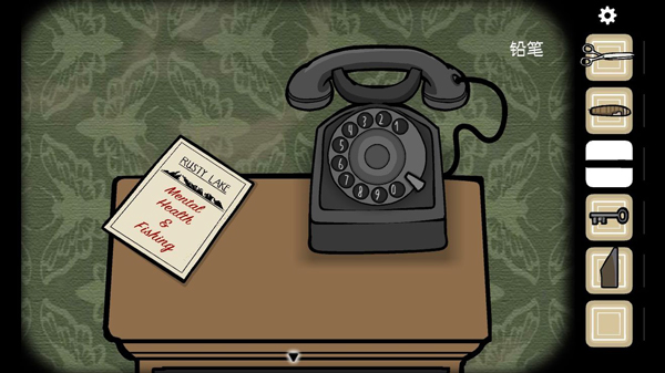 电话机旁有一张卡片,该卡片可翻转查看背面内容。点击界面右上角箭头可切换视角。