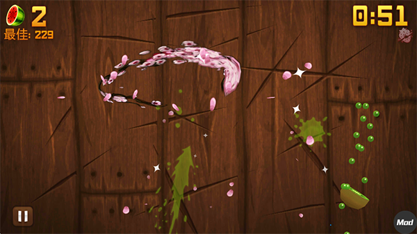 仅出现水果,限时90秒。目标是在限定时间内尽可能获得高分,水果掉落不会导致失败,适合专注练习连击与节奏控制。
