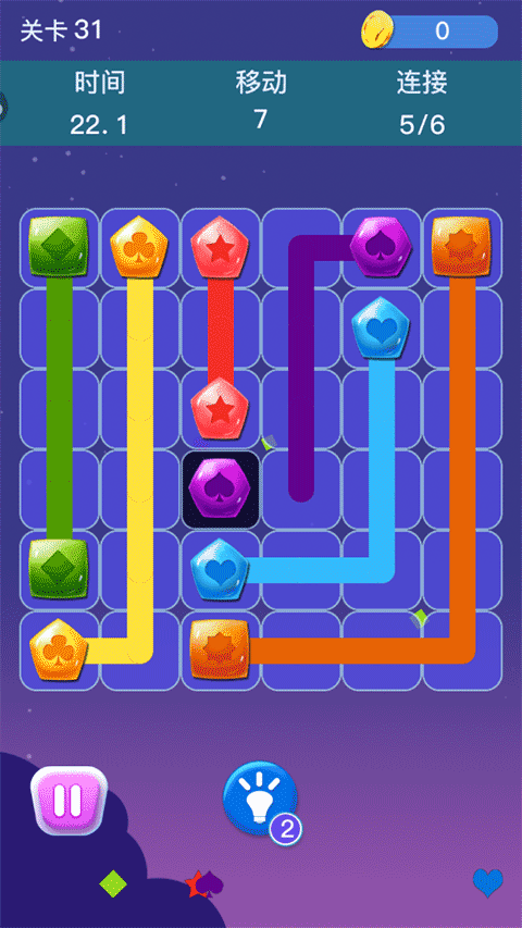 4、在宝石连线玩法,游戏采用的是闯关玩法,将同花色的方块连接到一起即可