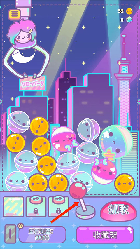 2、如图,可看到下面有很多各种各样的礼物球,左右摇动控制杆即可控制爪女孩的位置,