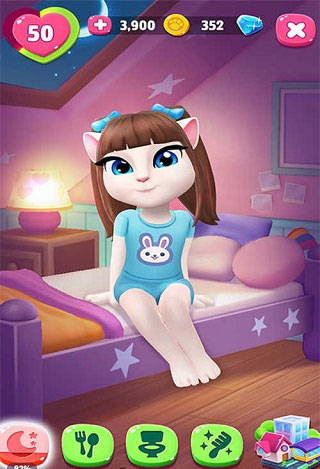 进入游戏后,安吉拉会热情地与你互动。当她的睡眠图标变为黄色或红色时,点击小床并打开床头灯,即可让她安心入睡。醒着时,可操作沙发上的游戏机赚取金币,或点击床头画作进行填色创作。左下角的装修按钮还能让你自由布置她的卧室,打造专属温馨小窝。