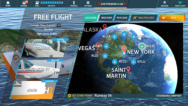 1、下载安装后进入游戏,点击右上角“FREE FLIGHT”下方的“fly”按钮即可开始自由飞行。