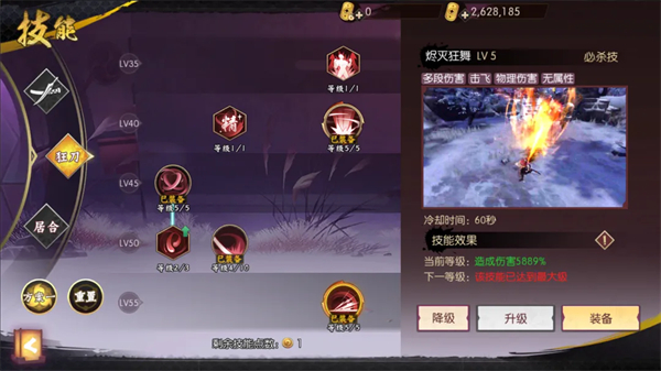 ④拔刀斩:拔刀斩是居合流派的技能,狂刀手里的拔刀斩没有了强化效果伤害就非常的尴尬,PVE中直接放弃,但PVP中可选择+1点满后置作为骚扰技能(拔刀斩的攻击距离还是比较远的),也可以点满作为连招衔接,当然不点也可以,依据个人的连招习惯去选择。