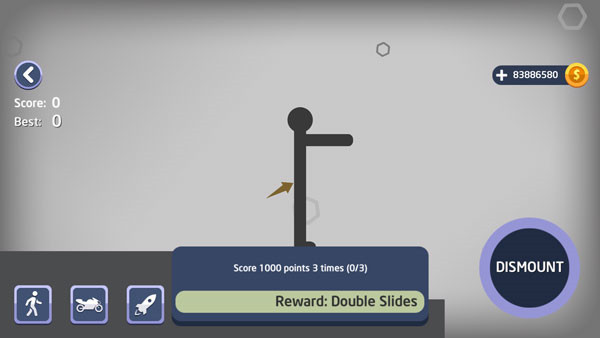 3、长按左下角的“DISMOUNT”按钮控制火柴人的行动与姿态。