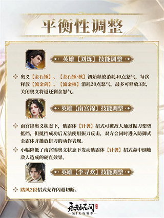 S11赛季部分英雄也将迎来调整。综合后台数据与玩家反馈,我们将对刘炼、南宫锦、李寻欢做出如下平衡性调整。