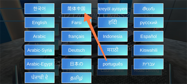 1、打开3D驾驶课2手机版,进入主界面后,点击右上角的地球图标(语言切换按钮)。