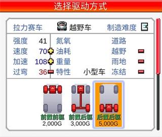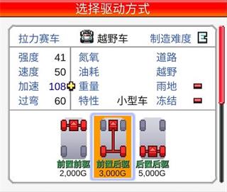 选择驱动方式,不同驱动类型影响车辆属性与道路适应能力。初期提供三种基础引擎,后续还将解锁更多选项。