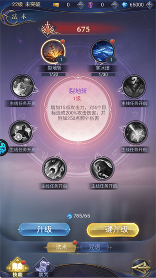 优先升级「裂地斩」「寒冰爆」等已解锁的主动技能,显著提升AOE伤害与清怪效率。合理分配技能点数和材料,使用「一键升级」功能最大化技能等级,并随等级提升及时学习新技能。