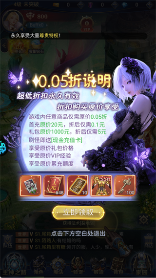 游戏内所有商品永久享受0.05折优惠,首充20元仅需0.1元,千元礼包仅需5元,且仍可获得对应原价的VIP经验与累计充值额度,性价比极高。