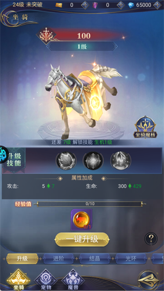 通过消耗坐骑经验道具并点击「一键升级」,可快速提升坐骑等级,直接增加攻击、生命等核心属性。当坐骑达到8级后,将解锁「生机」技能,提供续航或输出增益,进一步增强实战能力。