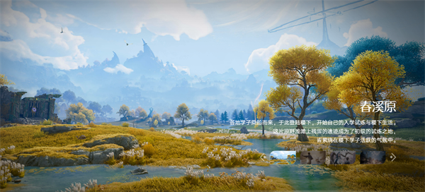 澄澈溪流蜿蜒穿过金黄草甸,上古石碑散落其间,远山叠翠,飞鸟掠空,构成一片生机盎然的新手试炼场。