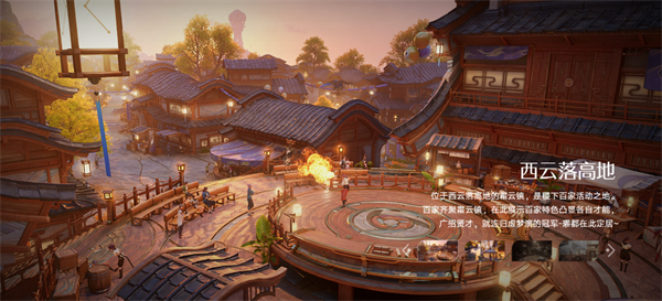 以霜云镇为核心的中式古镇,木构建筑鳞次栉比,灯笼暖光与广场篝火交相辉映,处处弥漫着浓郁的市井烟火气。