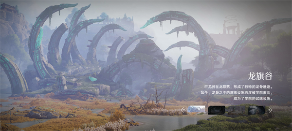上古巨龙陨落后形成的龙骨遗迹遍布峡谷,巨型骸骨泛着幽绿符文,荒草与浅溪点缀其间,弥漫着原始而磅礴的力量感。