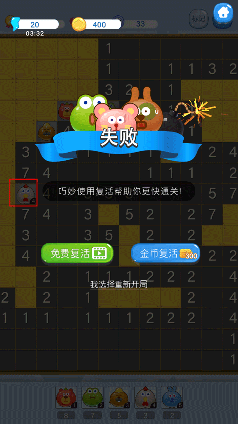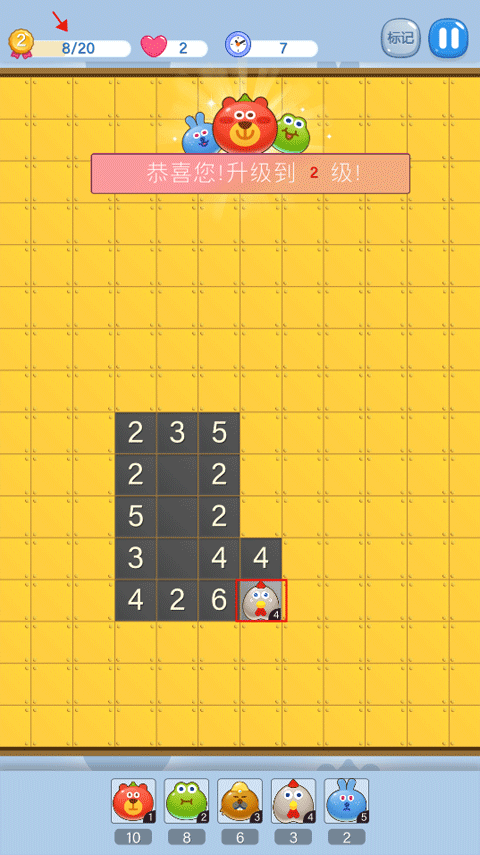 6、游戏开始时可随机点击一个黄色格子,系统会显示数字,该数字表示周围怪兽数量与等级之和。优先攻击低等级或同等级怪兽,有助于安全积累经验并升级。