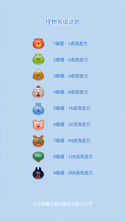 2、进入游戏后会弹出新手引导:每个格子中的数字代表其周围八个格子内所有怪兽等级的总和,不同等级的怪兽具有不同的攻击力。
