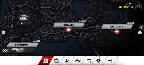 1、下载并安装极品飞车17最高通缉手游,进入游戏主页面后点击右上角的齿轮按钮。