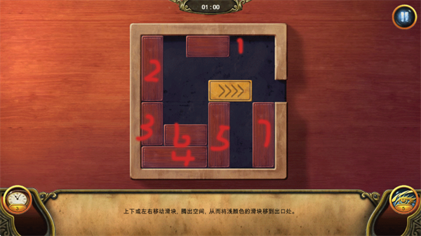 3、先上移1号木块,随后让3号木块向右滑动、2号木块下移,再将5号木块与黄色木块一起向右推进;接下来依次上移4号木块、上推2号木块、左移3号木块,最后让2号木块下移即可完成解谜。
