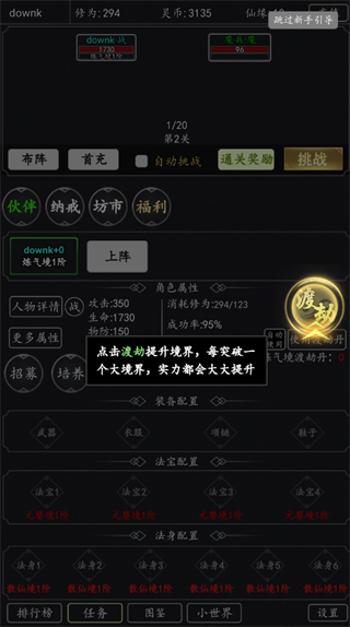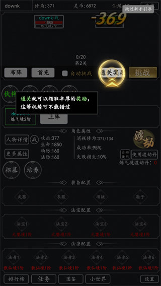 当修为满足条件后,可点击“渡劫”提升境界。渡劫成功率受当前修为影响,失败会损失10%修为,建议在成功率较高时操作,避免资源浪费。