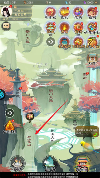 5、当战力达到一定水平后,可点击“寻访仙山”功能,解锁全新的探索玩法与剧情内容。