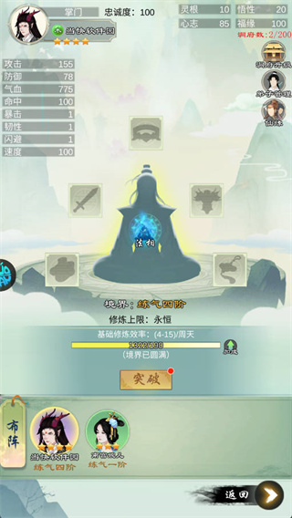 2、宗门发展完全由你做主:可专注培养核心弟子,激活祝融、九尾、应龙等山海经神话角色的仙缘羁绊;也可指派弟子打理丹房、灵田、藏经阁等设施。挂机即可累积修为,轻松突破筑基、金丹、元婴等境界,离线同样稳步飞升。