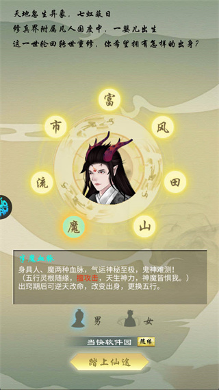 1、开局提供多种身份任选,无论是出身富贵世家、隐世散修,还是身负半魔血脉,每种身份搭配不同灵根天赋,带来截然不同的修行体验。