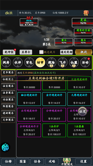 坊市中可使用灵币或仙缘购买渡劫丹、丹炉等实用道具,不同商店对应不同资源兑换内容。随着主角境界的提升,将逐步解锁更多坊市功能与高级商品,进一步加快养成节奏。
