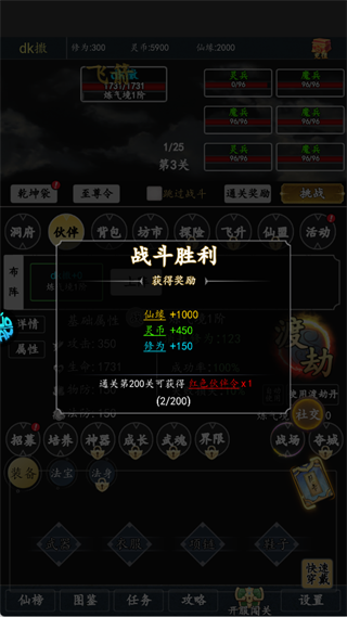 修为积累到一定程度后,需要通过战斗进一步提升实力。战斗胜利可获得仙缘、灵币与修为等奖励,通关关卡数越高,收益越丰富;当通关达到200关时,还可解锁强力红色伙伴,关卡推进是资源成长的核心玩法之一。