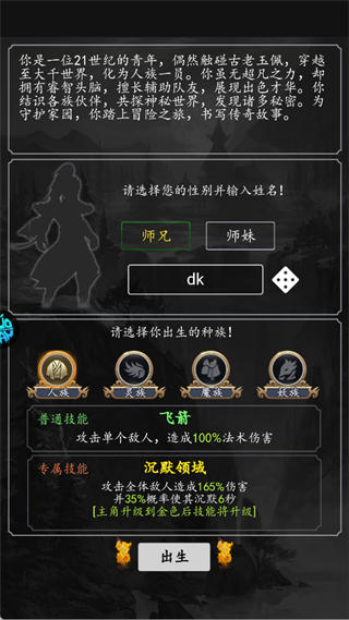 游戏开局可选择种族,默认为人族,同时提供灵族、魔族等多种选项。不同种族拥有各自的初始技能与成长方向,将显著影响前期战斗体验与后续培养路线。