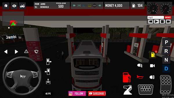 2、左边方向盘顾名思义控制方向,右下角分别为“手刹”“刹车”和“油门”,右上角是仪表盘和油量还有金钱,最后挂“d”挡就可以开动你的公交车了;