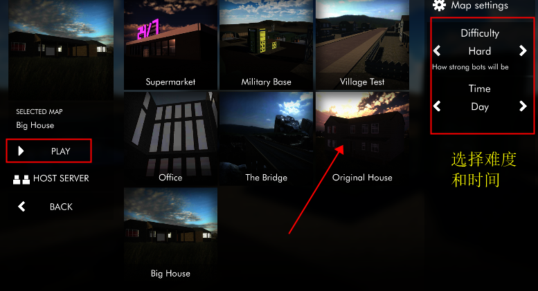 3、在右上角设定游戏难度与时长,中间区域选择地图,确认后点击左侧“Play”按钮进入游戏。