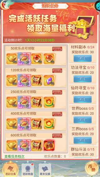完成材料副本、功法寻宝等任务攒欢乐点,可兑换海量元宝、道具等福利。