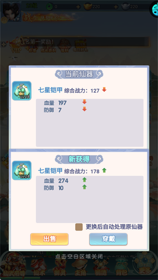 获得高等级仙器后直接【穿戴】,能快速提升战力和生存能力,低等级的也可以利用出售功能废物利用。