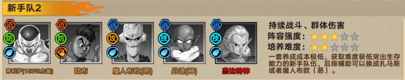 特点:适配团队作战与持续战斗,是平民玩家的悟空系阵容;后期可将后排输出替换为超赛贝吉特/SSG悟吉塔,辅助替换为赛亚蒙面超人/丹迪,培养难度略高于新手队。