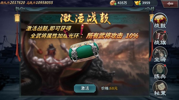 【战鼓】30级解锁。激活后为全体武将提供百分比属性加成。