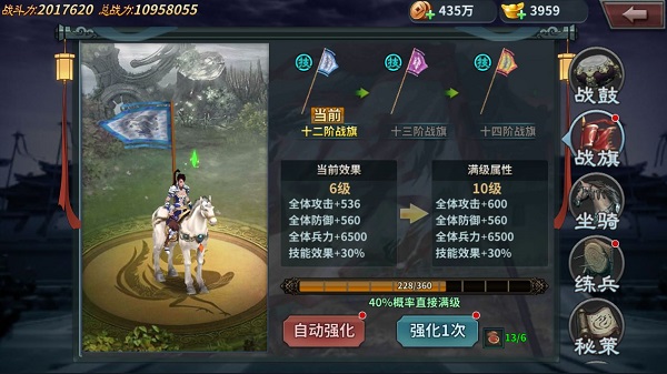 【战旗】35级解锁。消耗“灵漆”进行强化,强化有几率直接满级,大幅提升全属性。
