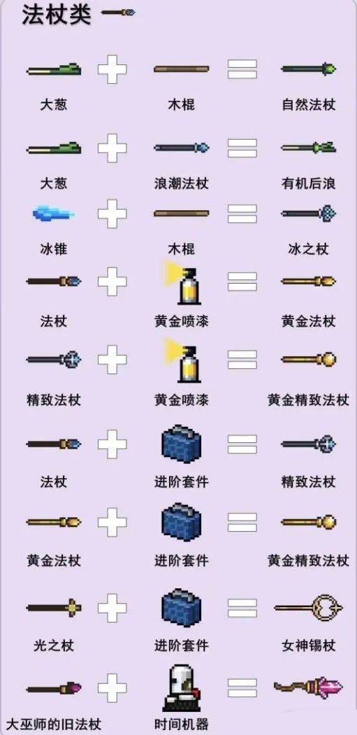 冰锥 + 木棍 = 冰之杖;大葱 + 木棍 = 自然法杖;大葱 + 浪潮法杖 = 有机后浪