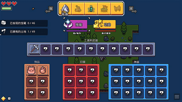 点击“装备”可查看已解锁的工具、武器、饰品、印章及神器;点击“技能”进入天赋树,使用技能点学习64项能力;点击“功勋”可查看成就进度,解锁头饰、翅膀、背包等外观奖励。