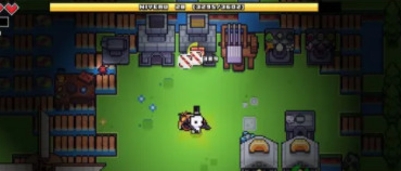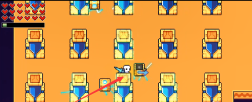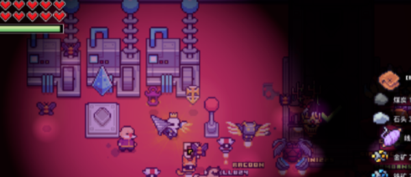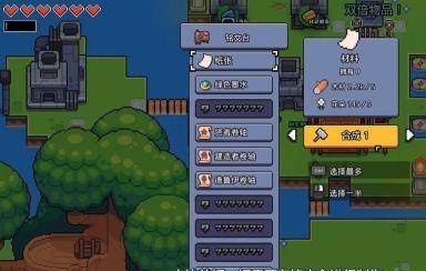 左上角绿色长条代表饥饿值,红色爱心代表健康值。饥饿值可通过食用食物恢复;若归零,则扣除1点健康值并自动恢复部分饥饿。健康值归零即游戏结束(可重新载入存档)。部分技能或道具可提升两项数值的上限。