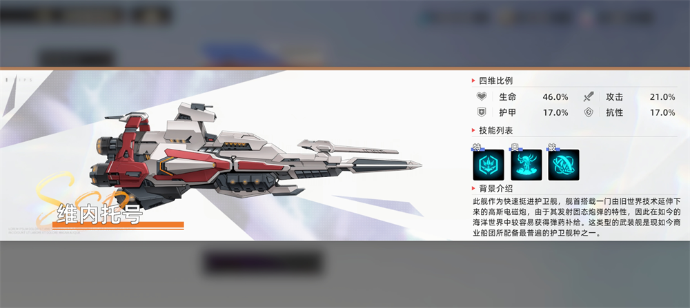 作为快速挺进型护卫舰,舰首装备一门源自旧世界技术的高斯电磁炮。因其使用固态炮弹,弹药补给相对便捷,是当前商业船团中最普遍配置的护卫舰种之一。
