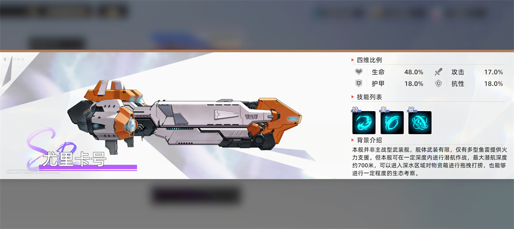 非主战型武装舰,仅配备多型鱼雷用于火力支援。其最大特色在于可潜航至约700米深度,执行深水物资打捞与生态考察任务,兼具功能性与战术灵活性。