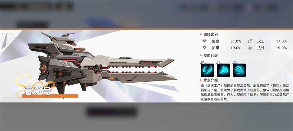 由『思维工厂』打造的重型武装舰,搭载『遗物』级阳电子炮。虽经轻量化改造以适配舰载需求,仍可在远距离造成毁灭性打击。作为大型船团『故乡』的主力舰,长期活跃于远征前线。
