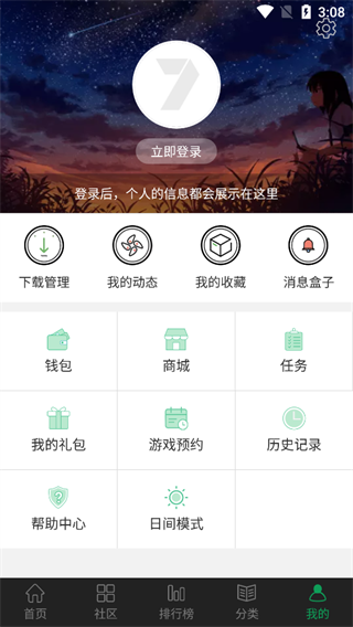 个人中心集成账户管理、下载记录、礼包领取、任务进度等功能,登录后还可查看收藏、动态及使用钱包、商城等增值服务。