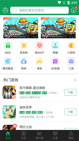 集中展示热门推荐、游戏分类及最新资源。用户可直接搜索心仪游戏,浏览资讯、下载安装包,并快速进入不同游戏类型或版本专区。