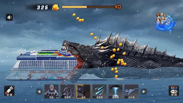 2、选择任意武器开始游戏,直接对船只发动攻击,成功摧毁后可获得金币奖励。