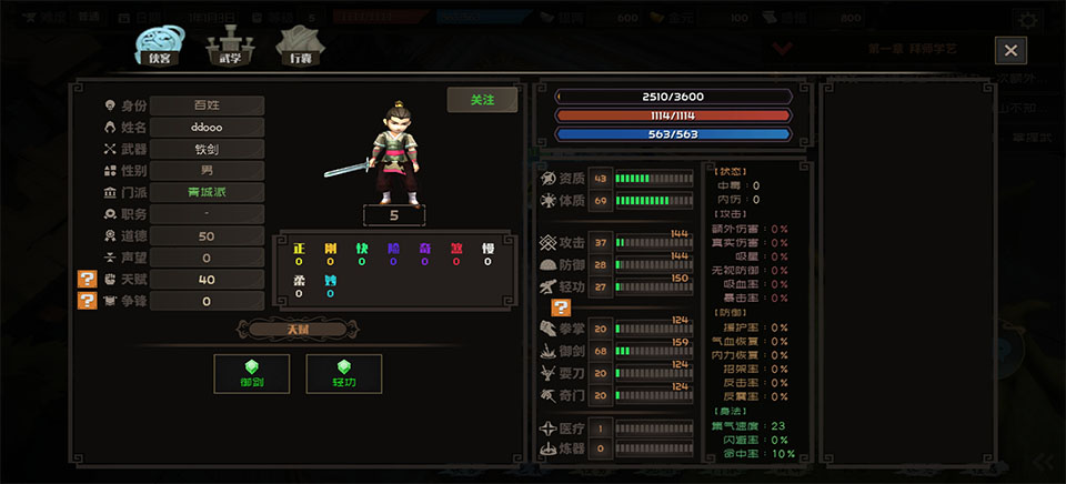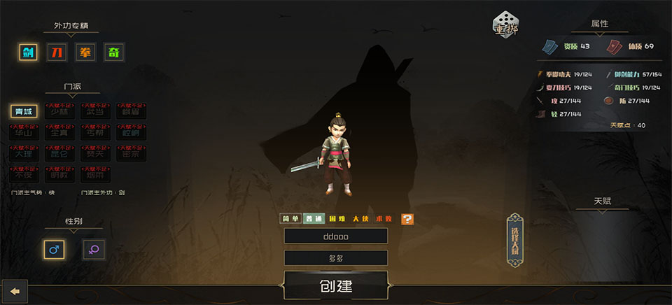 从姓名、相貌到初始天赋,完全自定义的专属侠客。以“记名弟子”的低微身份踏入江湖,体验从无名小卒到一代宗师的完整成长线。