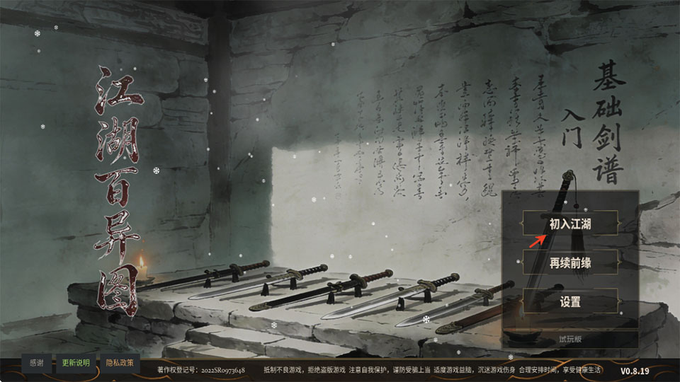 1、进入江湖百异图游戏内点击“初入江湖”开始游玩。