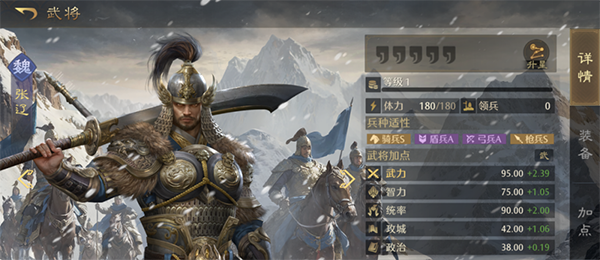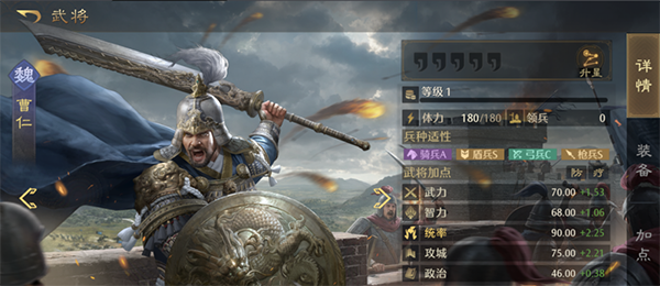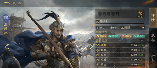 不同武将对各兵种有适应性数值(显示为BAS),位于武将体力条下方。适应度越高,属性加成越高:S为120%,A为100%,B为80%。