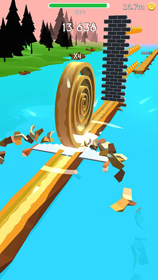 2、每关木头路径狭窄,前进途中会有电锯突然切断木块,需及时闪避;
