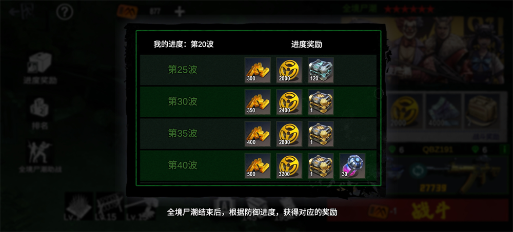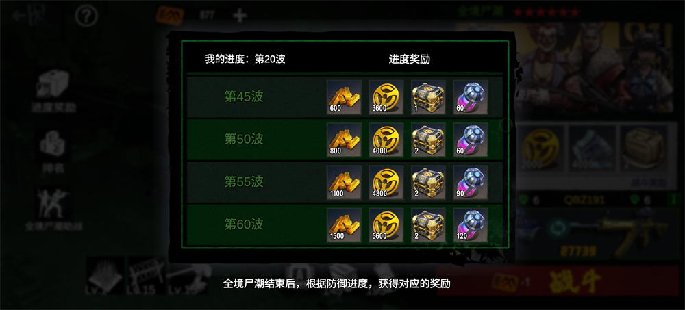 3. **全服奖励**:根据本期尸潮全服达成的最高波次,向所有玩家(无论是否参与)发放一份通用奖励。