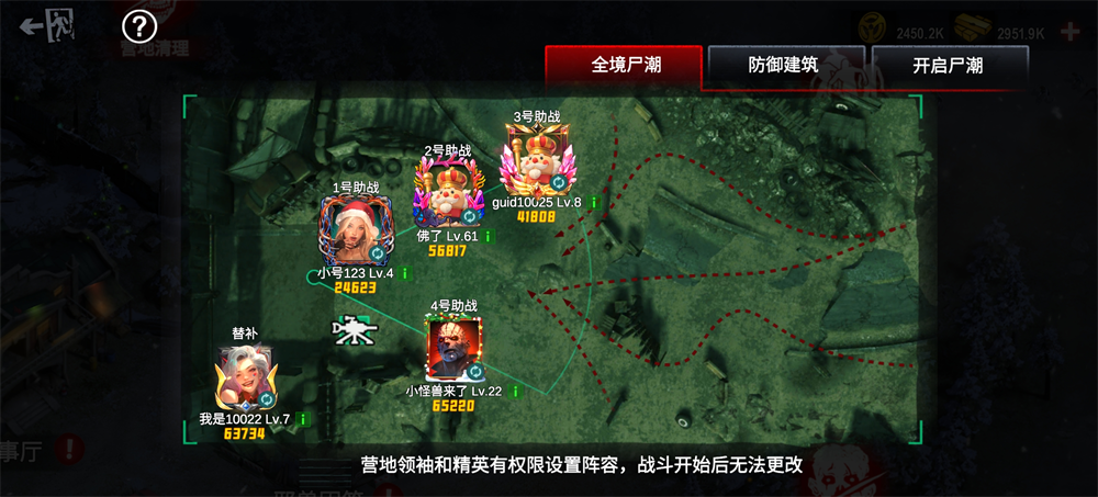 战斗采用“1+4”模式:玩家本人为主战角色,可正常操作;其余4名助战成员为营地固定配置,由营地管理员在开赛前指定。这些助战成员在每场战斗中均可使用,且无使用次数限制。若玩家本人被设为某号助战(例如2号),则在自身挑战时,系统将自动启用替补成员作为该位置助战。所有助战数据与营地普通尸潮互通,直接读取其武器配置,且营地防御设施在战斗中同样可用。